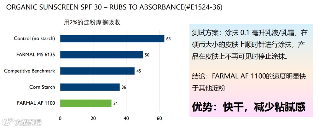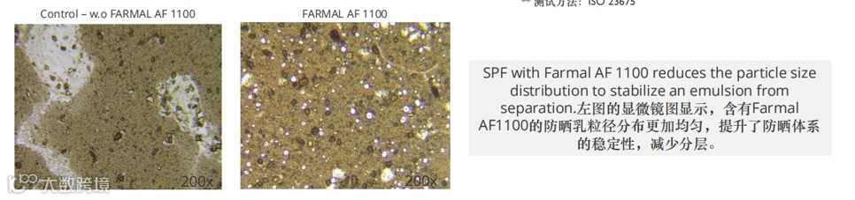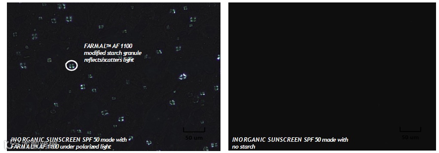 • FARMALTM AF 1100 改性淀粉在配方中起到粒子的作用,反射/散射光线,增加遇到防晒剂/紫外线吸收剂活性的机会
