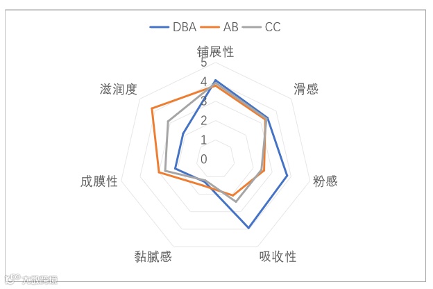 Sterol DBA与C12-15醇本甲酸酯、碳酸二辛酯对比肤感,其中成膜性和滋润度较低,铺展性、滑感、粘腻感比较接近,粉感和吸收性优于C12-15醇苯甲酸酯和碳酸二辛酯。