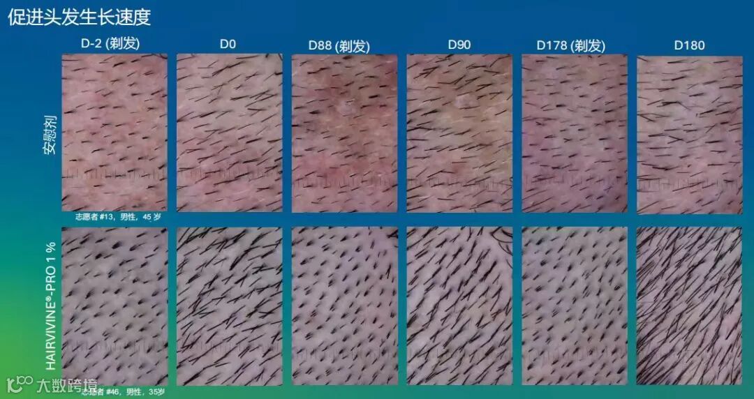 ▶90 天后,毛发生长速度显著提升至 0.02 毫米/天;180 天后进一步提升至 0.06 毫米/天 (总计增长1.08 厘米)。