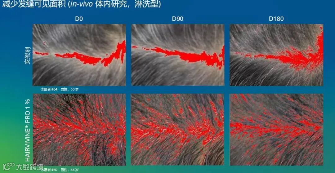 ▶90 天后,平均头发密度显著增加了 9.7 %,180 天后,平均头发密度显著增加了15.7 %。