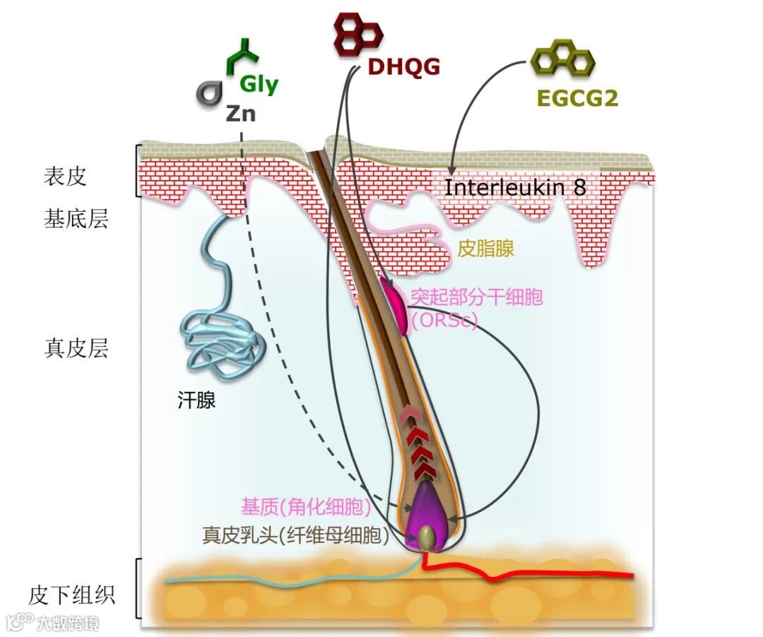 Redensyl是由4种分子协同混合得到(源于绿色和白色科技)的毛囊激活素,该成分作用于毛囊凸起部分干细胞(ORS)—头发生长的开关,在毛囊再生中起关键作用,Redensyl通过重启头发生长的开关,达到防脱密发的效果。