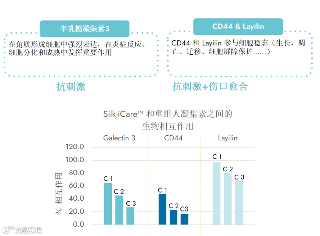 • Silk-iCare™ 与半乳糖凝集素3、CD44 和Layilin蛋白质相互作用,可以促进皮肤伤口愈合并保护皮肤免受刺激。