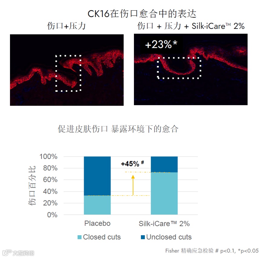 将Silk-iCare™ 应用于受伤皮肤后,在暴露环境(紫外线+ 污染)下,在伤口区域观察到CK16 表达增加+23%*,这意味着表皮恢复(+45%#)▼
