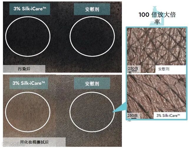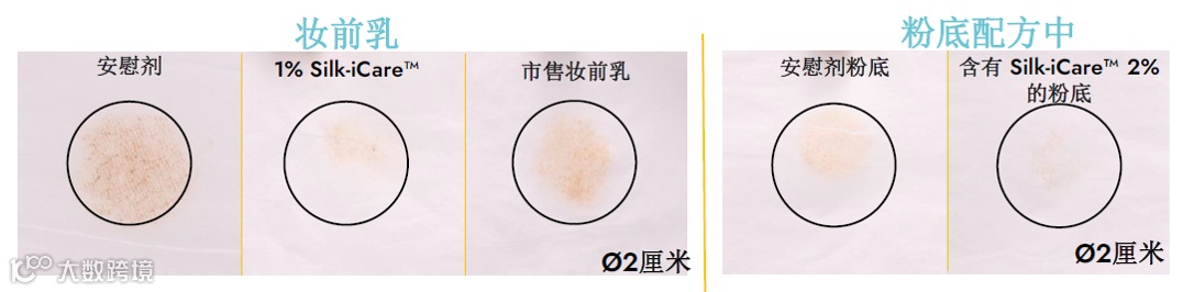 对于受试小组成员(示例)来说,使用Silk-iCareTM的皮肤可以更轻松地去除碳颗粒(污染)。用化妆棉在水下擦拭1.5分钟后,可以清楚地观察到Silk-iCare™和安慰剂之间的差异。