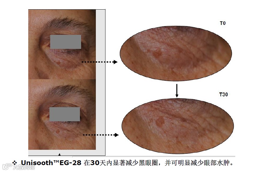 ▶25 人双盲临床,眼周 3%Unisooth EG-28 乳膏 30 天,a* 值(红色参数)↓21%,b* 值(蓝色参数)↓21%,可见的改善黑眼圈。