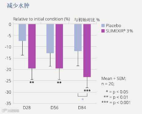 水肿区:使用28天后水肿显著减少19.6%, 84天后水肿显着减少23%。