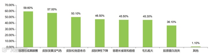 作为门面担当的肌肤当然逃不过熬夜晚睡带来的影响,在熬夜晚睡所带来的肌肤问题中,黑眼圈,皮肤发黄没气色,皮肤松弛显老占据前三位置,占比均在50.0%以上。其次是皮肤弹性下降、容易长雀斑、毛孔粗大、胶原蛋白流失等肌肤问题,总体来看,由熬夜晚睡带来的肌肤影响,无论哪一个肌肤问题,对爱美的晚睡党来说,都是一场颜值灾难。