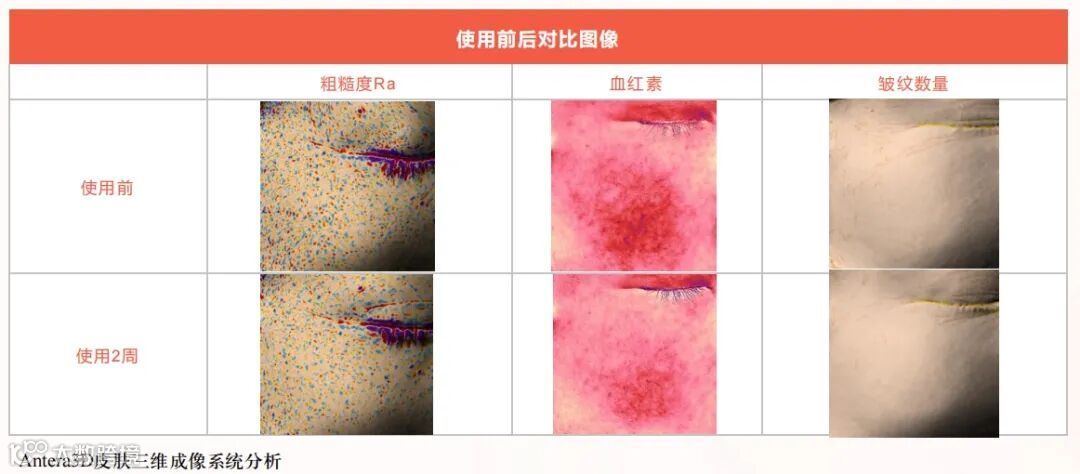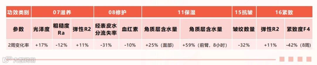 其人体功效评价报告显示,在使用2周后,经表皮水分流失率-31%,血红素-10%;皮肤光泽度+17%,粗糙度-12%,弹性+11%,皱纹数量-32%▼