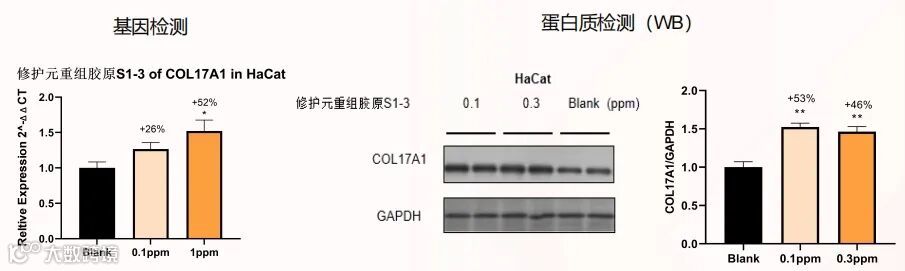 重组胶原S1-3促进表皮细胞XVII胶原(COL17A1)的基因表达和蛋白质表达,从而有助于强化基底层。