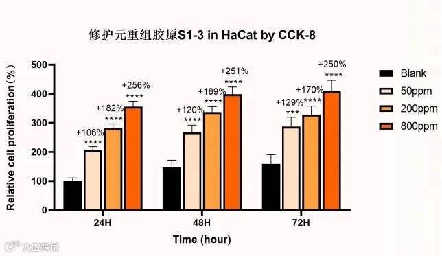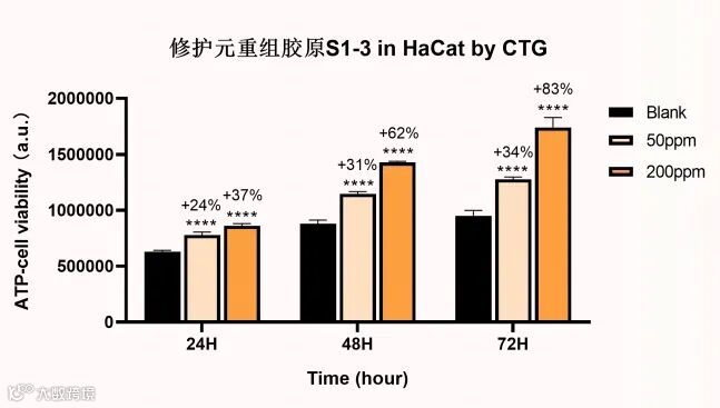 重组胶原S1-3于 24h、48h和72h显著促进表皮细胞的增殖;并显著提升了表皮细胞的ATP-细胞活力值。