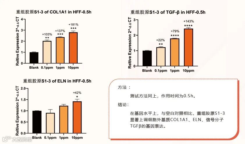 在基因水平上,与空白对照相比,重组胶原S1-3显著上调细胞外基质COL1A1、ELN、信号分子TGFβ的基因表达▼