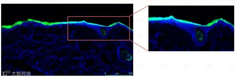 通过Franz cell扩散池实验,结果显示24小时后,FITC标记的重组胶原S1-3的绿色荧光信号与DAPI染色的蓝光信号在猪皮浅表层位置重合,这表明该产品能够有效渗透至活表皮层。