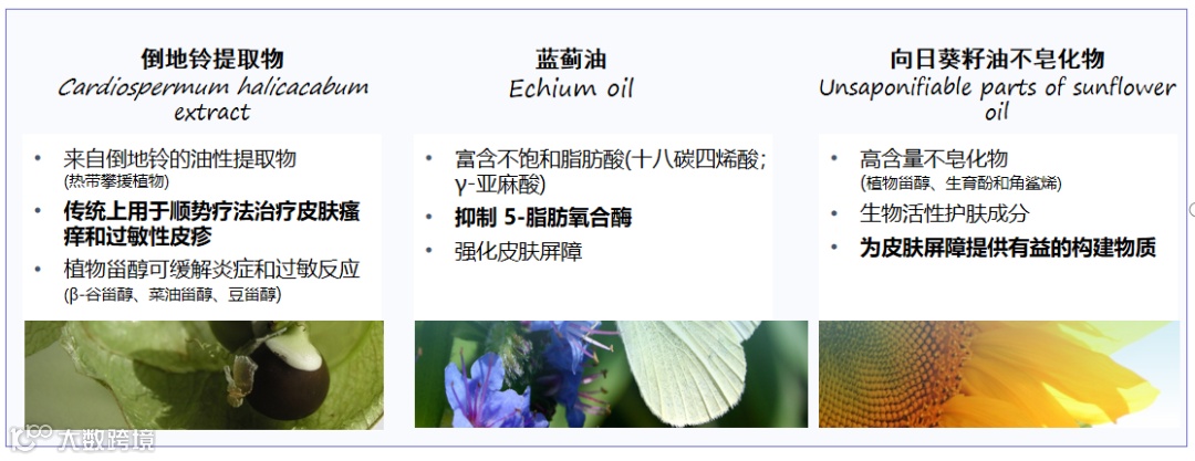 在众多文献研究中,倒地铃提取物被发现具有舒缓皮肤,减少过敏的作用。它富含植物甾醇,类黄酮,皂苷,鞣酸,植物甾醇,可抑制磷脂酶A2和环氧合酶-2,从而减少炎症和过敏反应,因此被誉为氢化可的松的“温和”安全的植物替代品。