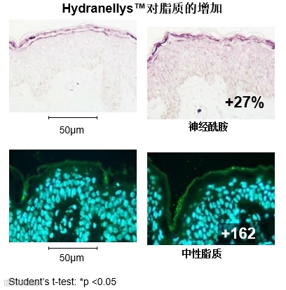 来自39岁高加索女性腹部的皮肤外植体,诱导形成干性肌肤模型。将含3%Hydranellys™的CMC水性凝胶涂在脱脂的外植体上。 24小时后通过评估脂质合成。