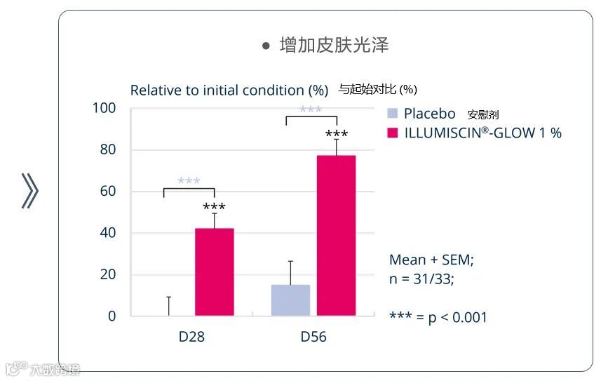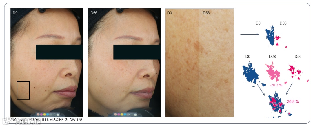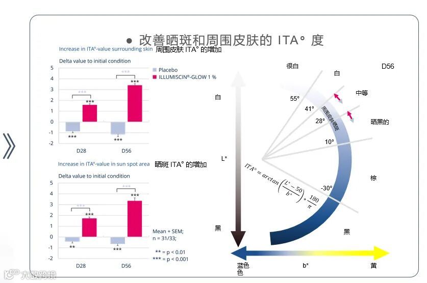 41°)的 ITA° 值有所改善,肤色变浅。与没有积极效果的安慰剂相比,ILLUMISCIN®-GLOW 的改善效果高达5.3倍。
