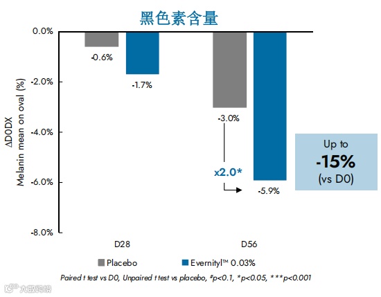 Evernityl™面部使用 56 天后,显著降低黑色素平均值,降低了5.9%,效果是安慰剂的 2 倍。