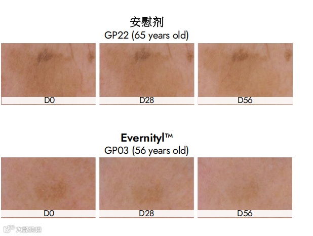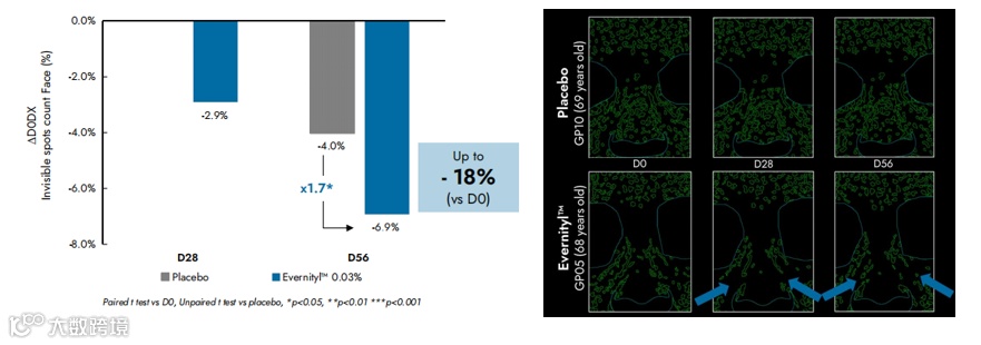 ●Evernityl™ 在使用 56 天后,显著减少了面部斑点前体的数量,与 D0 相比减少了 6.9%,效果是安慰剂的 1.7 倍。