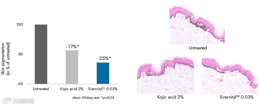 Evernityl™强力减少皮肤外植体中的黑色素含量25%,是曲酸的100倍多!