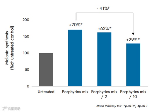 ●将卟啉浓度降低 10 倍会导致黑色素生成减少 41%▼