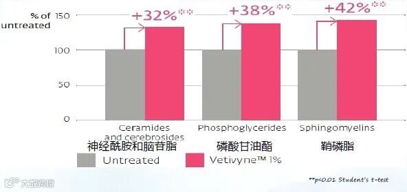 Vetivyne™ 显著地增加表皮中神经酰胺及其各种前体的生成,最高达+42%!