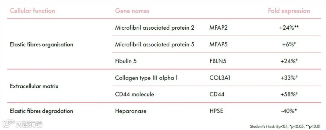 来自星芒杉藻提取物的特定馏分能够重新启动皮肤细胞外基质中关键生物标志物的产生,例如: •I型胶原蛋白 •II型胶原蛋白 •III型胶原蛋白 •Fibulin-5▼