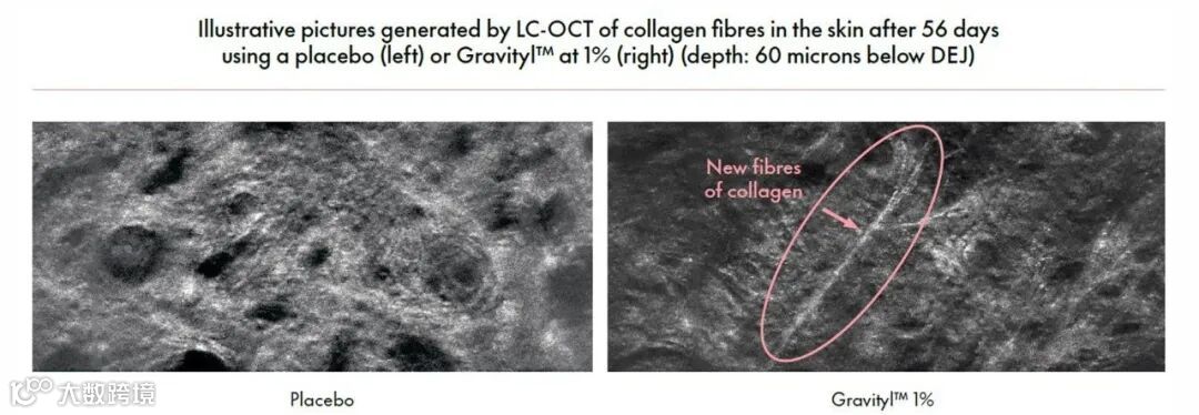 通过LC-OCT对真皮-表皮交界处下方的胶原纤维的可视化展现,结果显示:1%的Gravityl增加新的胶原纤维的生成。