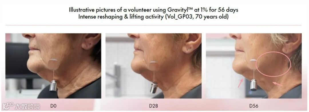 从志愿者的脸颊悬垂重物后的面部重塑和提拉效果可以看出,面部轮廓和皮肤紧致度,包括皮肤质感在视觉上得到改善。