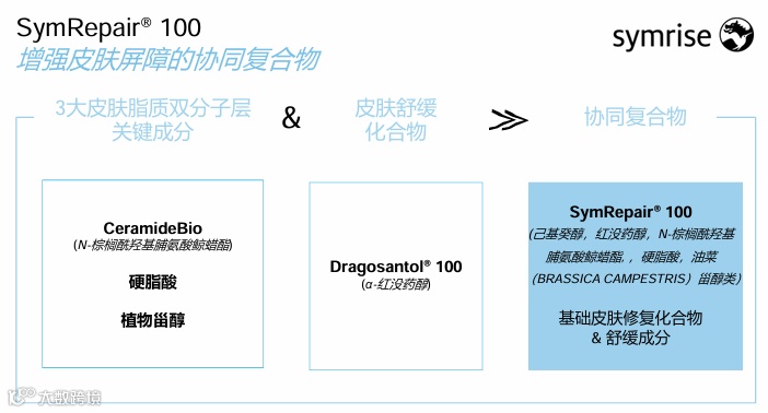 SymRepair®100是 高效的皮肤屏障修复复合物,模拟皮肤角质层双分子膜的三个主要成分(神经酰胺、游离脂肪酸、胆固醇), 用以供给皮肤其所必须的修复元素。与红没药醇结合,修复皮肤屏障同时构建更强固的皮肤(强韧砖墙结构)