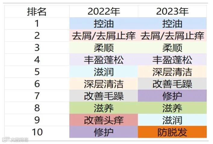 电商数据显示,控油、去屑功效的洗发水稳居销售榜前列。对比2022年,滋润功效排名显著下跌。修护、防脱发功效的产品排名有所提升。