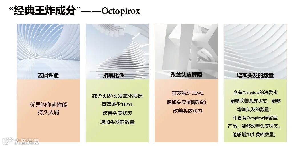 OCTOPIROX®具有优异的去屑性能,还具有头皮&头发的抗氧化性能,控油,改善头皮屏障,增加头发数量的功能,并兼具防腐性能。