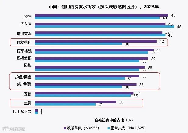 在其他功效上,敏感头皮消费者比正常头皮消费者更偏好修复损伤、护色/固色、减少断发、生发功效。这一数据从侧面说明,敏感头皮消费者非常注重头发的质量和健康。