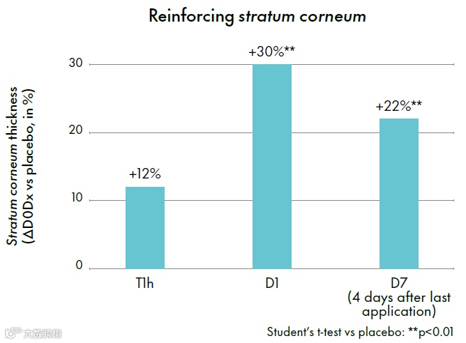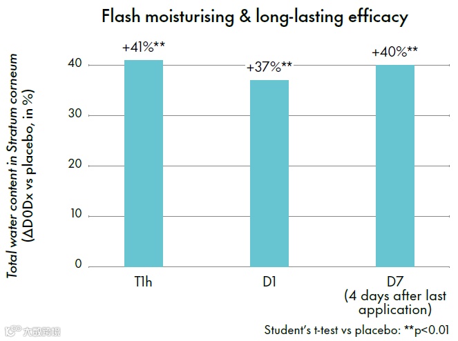 首次使用后仅 1 小时,即可观察到即时保湿效果,与安慰剂相比,皮肤提升的水含量为 +41%(与 T0 相比为 +70%)。
