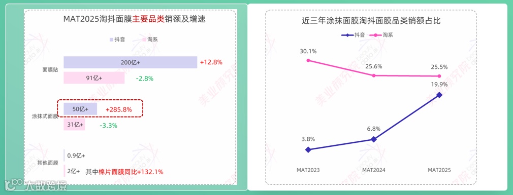 镜头下,一勺粉、一抹水,30秒幻变奶油质地,再厚敷上脸,撕膜瞬间的“透亮滤镜”极具爽感,天然适配抖音等短视频节奏,涂抹式面膜在抖音渠道,借力平台可视化种草特性,实现销售额快速扩张。