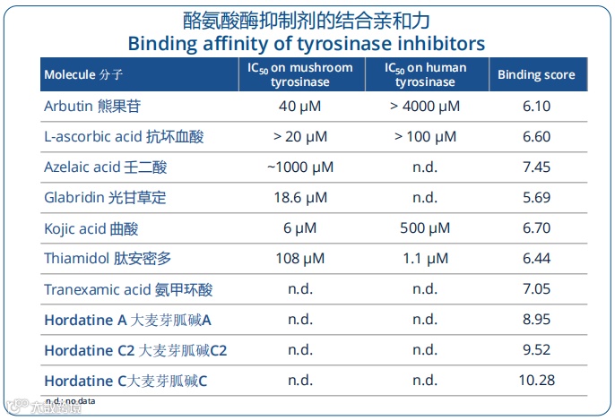 结果:已知酪氨酸酶抑制剂在常用的蘑菇酪氨酸酶和人类酪氨酸酶之间,文献值差异很大。大麦芽胍碱显示出极佳的 in-silico 计算机结合评分Binding Score,表明其对人类酪氨酸酶的IC50 很低。