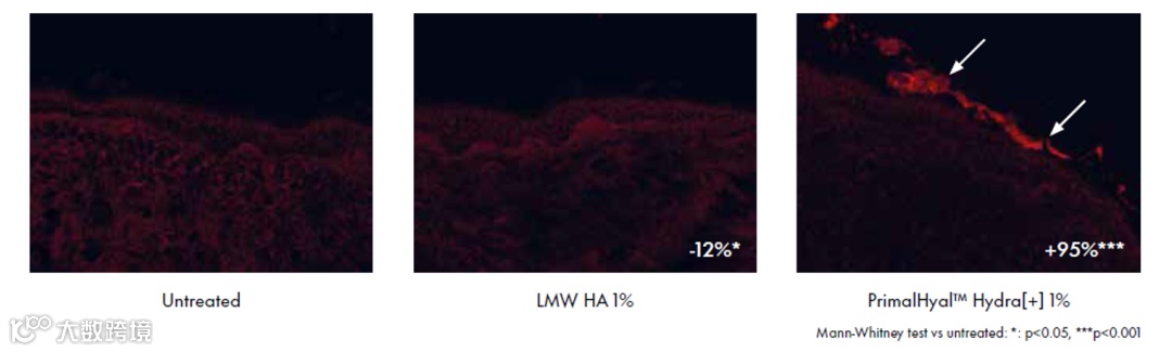 皮肤外植体(来自一名 22 岁的供体)未经处理或使用 PrimalHyal™ Hydra[+] 或同等分子量 (20-50 kDa) 的 HA 以 0.1% 浓度局部处理 5 分钟,然后冲洗(5 次)。该实验方案分别于 D0、D1 和 D2应用三次。第 3 次涂抹(和冲洗)后,使用免疫染色法评估皮肤中水通道蛋白和聚丝蛋白的量。