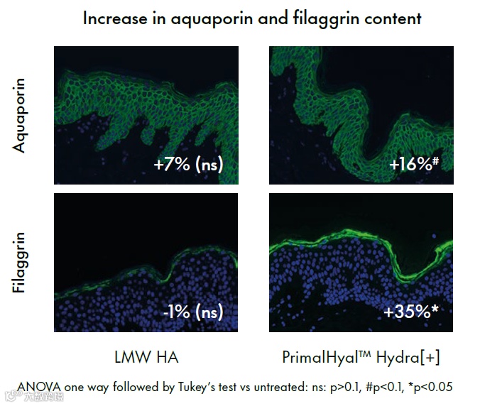 ▶ 结果:与“标准”级别的 HA 相比,PrimalHyal™ Hydra[+] 在冲洗条件下显著增加了参与皮肤水合作用和屏障功能的关键蛋白质水通道蛋白和聚丝蛋白的合成。
