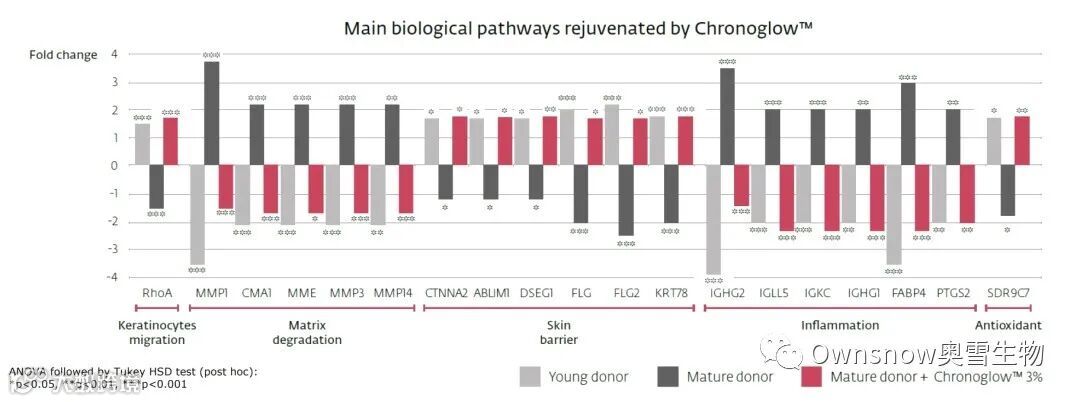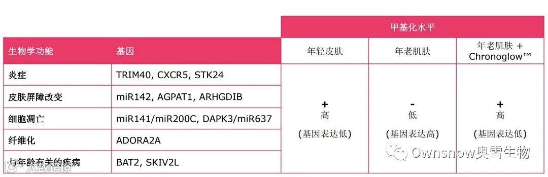 与年轻皮肤相比,所有这些功能在成熟皮肤中都过表达,但使用Chronoglow™时显著受到抑制,显示出明显的甲基化组年轻化。