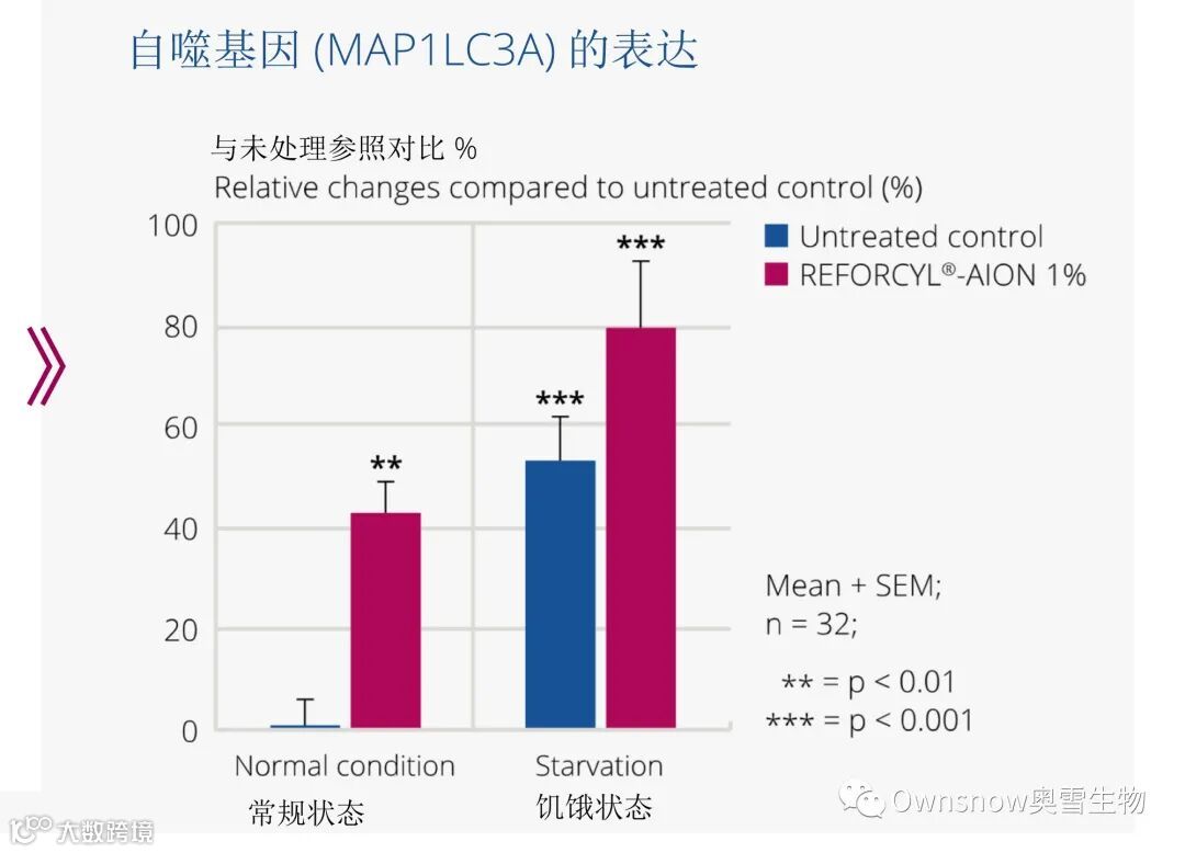 REFORCYL®-AION含有的活性物质可以激活自噬机制,通过上调与自噬相关的 LC3A 基因诱导自噬,并强化我们的线粒体功能,给自噬行为提供更多的能量。