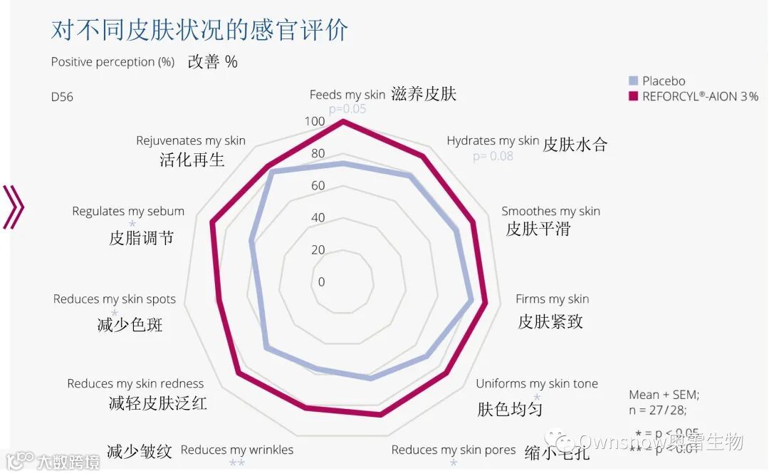 在使用含有3% REFORCYL®-AION 的产品后,100 % 的受访者认为所有皮肤参数都有所改善。