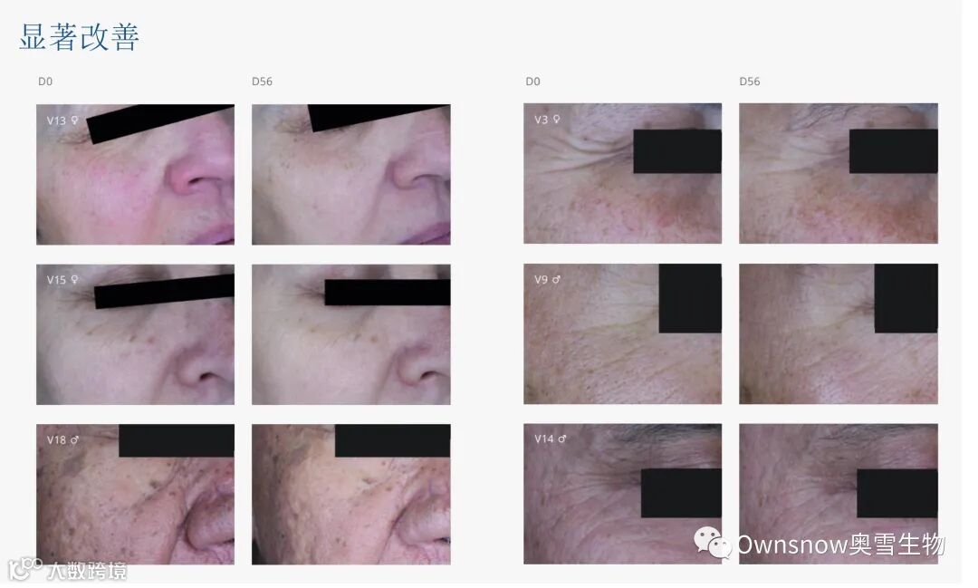 从志愿者56天的改善情况来看,泛红,斑点,皱纹均有非常显著的改善。
