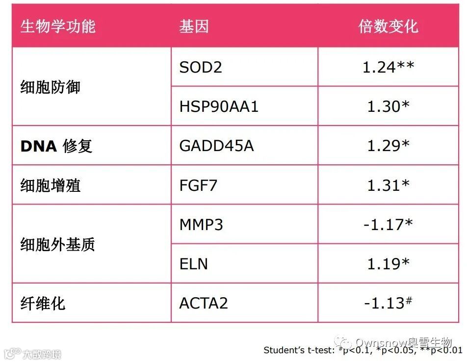 试验结果表明,Chronoglow™对于细胞的修护,防御等方向均为促进作用,而对于基质降解和细胞纤维化等不利的方向均为抑制作用,以此从细胞层面来扭转衰老的状态。