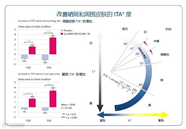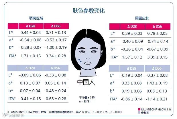 结果显示:使用ILLUMISCIN®-GLOW后,晒斑的ITA°改善,肤色变浅。L*、a* 和 b* 肤色参数改善,肤色变白,黄度降低。