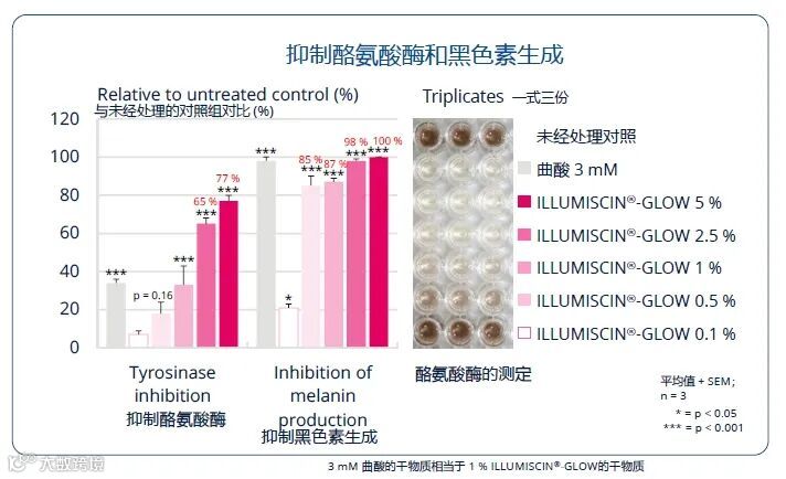 结果显示:ILLUMISCIN®-GLOW显著抑制酪氨酸酶活性和黑色素生成(IC50= 0.22 %),效果优于曲酸▼