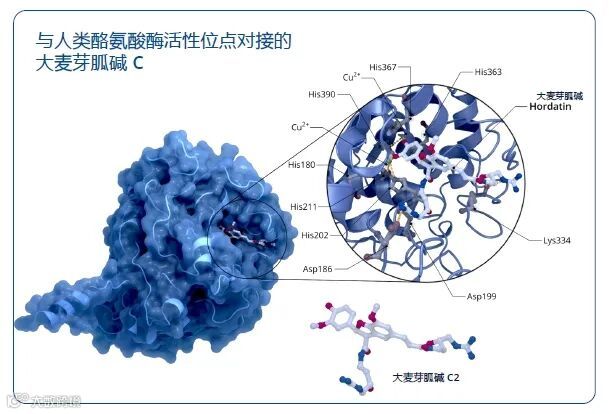 利用人工智能模型,将大麦芽胍碱C2 与人类酪氨酸酶模型进行in-silico计算机对接。