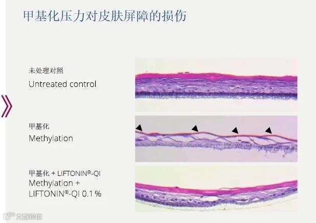 ▶甲基化压力下,角质层从细胞集合中剥脱,使用LIFTONIN®-QI,可显著阻止角质层的剥脱,皮肤屏障更强。