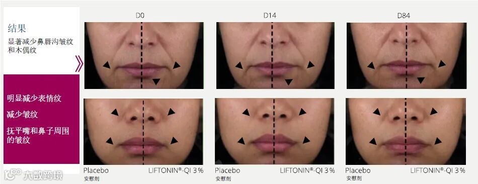 ▶明显减少表情纹;减少皱纹;抚平嘴和鼻子周围的皱纹