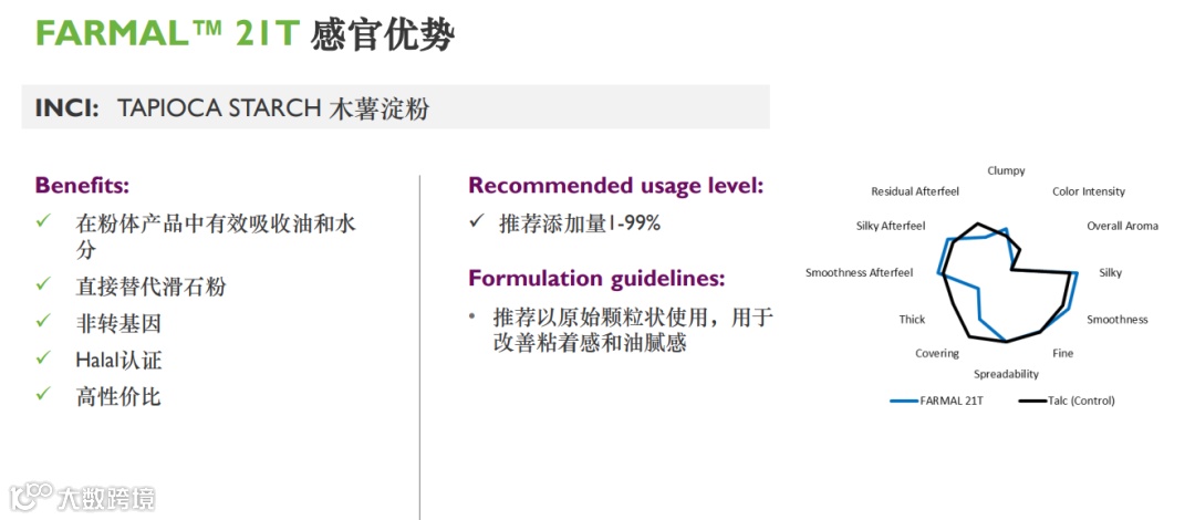 其中FARMAL 21T是来自泰国的天然木薯淀粉,木薯淀粉柔软,干爽的肤感深受欢迎。