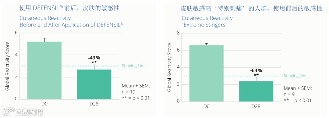 针对在鼻翼处应用10%乳酸刺激皮肤引起的皮肤刺痛,DEFENSIL能显著降低皮肤的刺痛,尤其是“敏感人群”能带来更显著的效果,降低皮肤的敏感度。