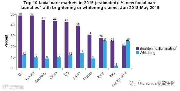 获得健康的外观皮肤是全球消费者的主要目标。提亮肤色的宣称在大部分国家都是主流宣称,除了印度和韩国,这两个国家美白和提亮都是主流宣称。