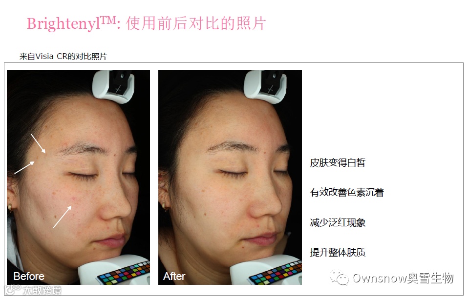 临床数据表明:Brightenyl®可减少晒斑和均匀肤色、提升皮肤明亮度、减少皮肤泛红现象、提升皮肤美白度、缩小毛孔。